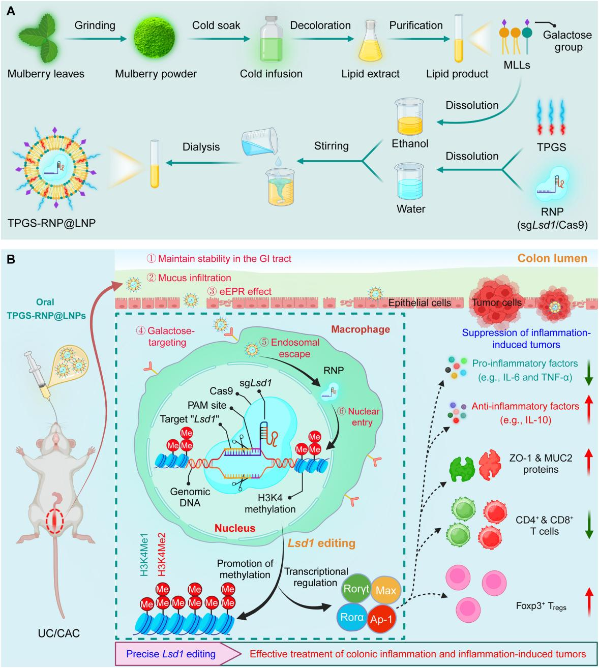 鉴于此,肖波教授团队开发了一种经实验室优化的口服递送平台:将靶向 Lsd1的RNP封装进桑叶来源的脂质纳米颗粒(MLLs),并加入FDA批准的稳定剂d-α-生育酚聚乙二醇琥珀酸酯(TPGS)(图1A)。TPGS的引入显著增强了LNP的脂质双分子层稳定性,使其能够在胃肠环境中高效递送RNP,并提高了其穿透结肠黏液屏障的能力。进一步地,TPGS-RNP@LNPs通过上皮细胞增强通透与滞留效应(EPR效应)在炎症结肠组织中富集,并通过半乳糖受体实现对巨噬细胞的特异性靶向。同时,纳米颗粒与内体膜的膜融合机制结合Cas9的核定位信号,确保了RNP的高效核递送。最终,该系统在小鼠中实现了显著的基因编辑效果,并有效缓解了UC和CAC(图1B)。