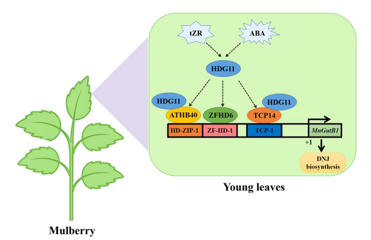 该项研究首次揭示了植物激素信号如何通过复杂的转录调控网络,精准控制桑树DNJ的组织特异性与发育时序积累,提出了一个“HDG11→(ZFHD6/TCP14/ATHB40)→MnGutB1→DNJ产量”的完整调控模型。这一发现不仅为深入理解亚氨基糖代谢提供了关键线索,也为通过分子育种或合成生物学实现高产DNJ新品系构建、天然药物资源提升提供了理论支撑。