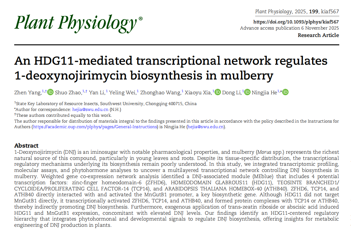 近日,资源昆虫高效养殖与利用全国重点实验室何宁佳团队在桑树特色活性成分1-脱氧野尻霉素(1-deoxynojirimycin,DNJ)的生物合成调控研究方面取得重要进展,在中科院期刊分区一区TOP期刊Plant Physiology杂志上以“An HDG11-mediated transcriptional network regulates 1-deoxynojirimycin biosynthesis in mulberry”为题发表研究论文。该研究首次成功构建并解析了一个以转录因子HDG11为核心、整合细胞分裂素tZR与脱落酸ABA信号的多层级转录调控网络,系统揭示了桑树DNJ生物合成的关键调控机制,为提升DNJ产量、创制高附加值天然药用资源提供了新的理论支撑和应用方向。