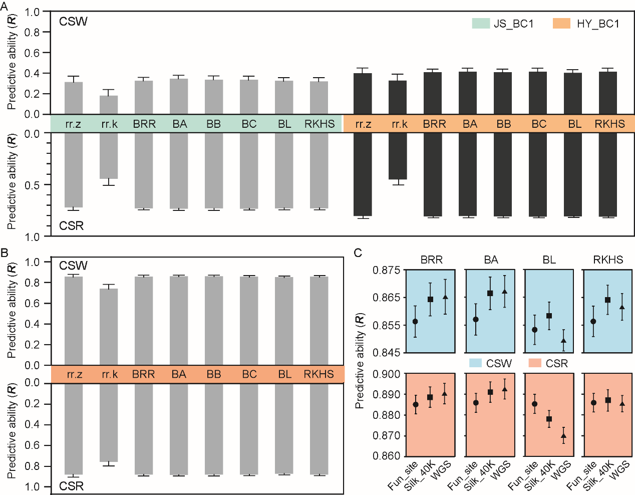 更重要的是,本研究首次证明了基因组选择在家蚕育种中的重大潜力。基于Silk_40K芯片,团队在回交分离群体和种质资源群体中对全茧量(CSW)和茧层率(CSR)进行了基因组预测,均获得较高的预测准确性,其中种质资源群体中对CSW和CSR的预测准确度分别高达0.866和0.891。这一成果为家蚕茧丝产量、品质等复杂性状的基因组选择改良提供了关键工具支撑,对于通过品种源头创新推动蚕桑产业高质量发展具有重要意义。