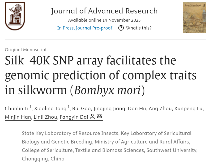 西南大学资源昆虫高效养殖与利用全国重点实验室主任、国家蚕桑产业技术体系首席科学家代方银教授团队基于前期成果“千蚕泛基因组”研发首款家蚕全基因组SNP育种芯片—Silk_40K SNP Array,首次证明基于育种芯片的基因组选择可实现家蚕复杂育种性状的高效改良,为家蚕基因组选择育种提供了关键工具与理论支撑。2025年11月14日,研究成果在线发表于国际知名期刊Journal of Advanced Research(中科院一区Top,IF=13)。