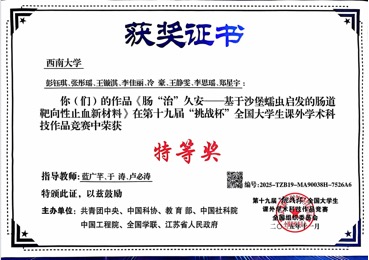 据了解,“挑战杯”是我国大学生科技创新领域层次最高、规模最大、覆盖面最广的标志性赛事,被誉为大学生科技创新的“奥林匹克”。本届大赛以“青春为中国式现代化挺膺担当”为主题,吸引了来自全国 2700 余所高校的 40 余万件作品、300 余万名学生同台竞技。此次获奖再次表明蚕桑纺织与生物质科学学院/资源昆虫高效养殖与利用全国重点实验室在创新型人才培养方面取得卓越成效,蚕丝蛋白在医学领域的利用得到了全国同行的高度认可。面向未来,团队将以此为契机,持续深耕相关领域,推动科研成果向实际应用转化,努力以科技创新回应时代需求,用青春力量为中国式现代化贡献智慧与担当。