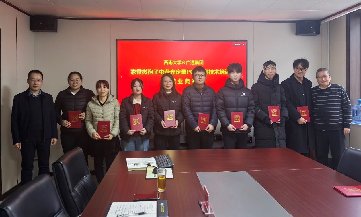期间,李田、潘国庆代表实验室为参加“家蚕微孢子虫荧光定量PCR检测技术培训班”的9名广通集团技术骨干颁发了培训合格证书,标志着双方在专业技术人才联合培养和技能培训方面迈出坚实一步。