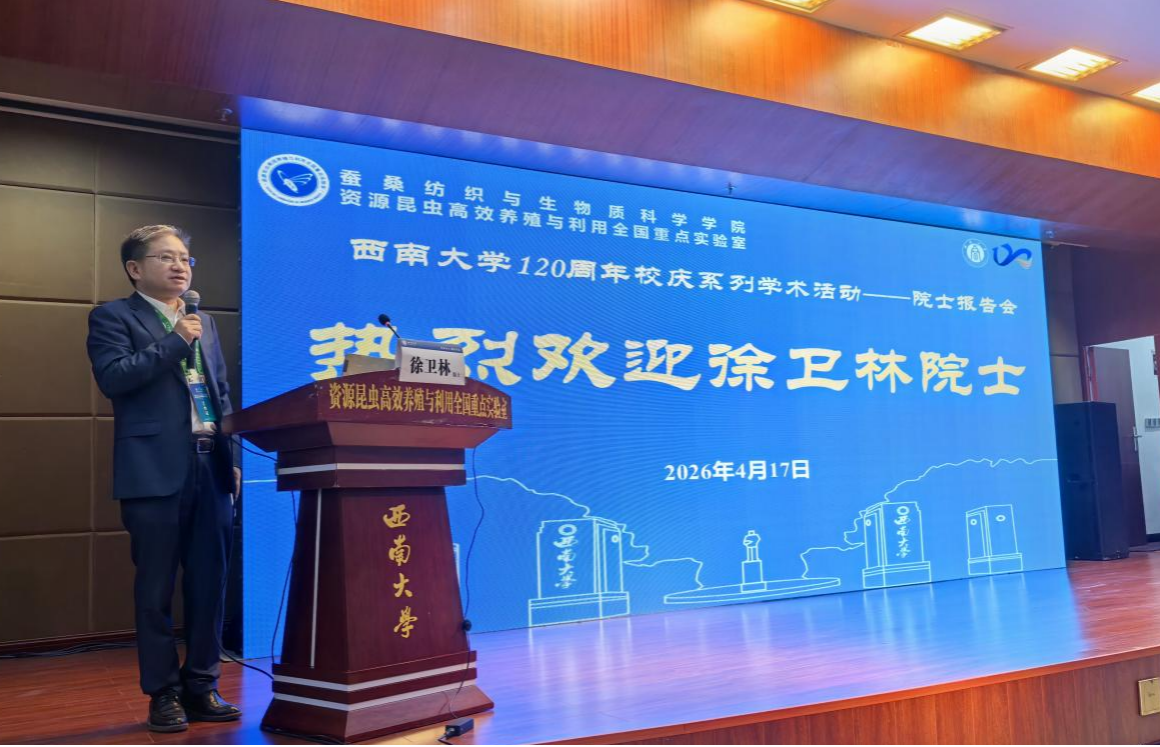 4月17日下午,值西南大学120周年校庆之际,资源昆虫高效养殖与利用全国重点实验室与蚕桑纺织与生物质科学学院在蚕学宫报告厅举行院士报告会,特邀中国工程院院士、武汉纺织大学党委书记徐卫林教授作学术报告。报告会由实验室主任代方银主持。